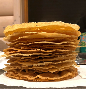 Et maintenant, place à la cuisson ! À l’aide de deux fourchettes, chaque feuille de pain est délicatement plongée dans l’huile bouillante pendant quelques secondes puis retirée avec la même attention, déposée sur un papier absorbant et enfin aplatie à l’aide d’une poêle à crêpe, d’une planche, ou de ce que vous avez sous la main qui garantira l’allure recherchée. « La journée de préparation commence généralement à midi et finit tard le soir ! » confie Harpa.