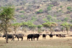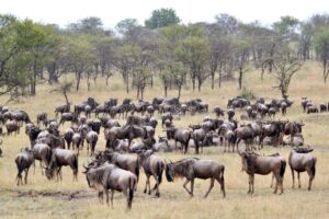 En février, les gnous s’installent dans les plaines d’herbe rase de la partie sud-est du circuit migratoire et donnent naissance à environ 500 000 veaux. À la fin des pluies de mai, les animaux se déplacent vers le nord-ouest autour de la rivière Grumeti, où ils restent généralement jusqu’à la fin juin.