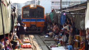 Ce matin partez en direction de Maeklong train market. Vous pouvez aussi choisir de voir arriver le train à 08h30, pensez à y être autour de 08h00 afin de vous positionner correctement. Placez-vous près de la voix au niveau des barrières, ce qui vous permettra de saisir le train à son arrivée et au départ tout en vous assurant une expérience la plus authentique possible.