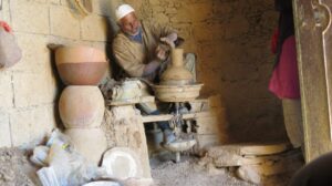 En matinée, atelier(s) artisanal(aux) aux choix : construction en pierre sèche, tissage de laine, teinture, bijouterie en argent, tressage de toit en fibres, poterie. Il s’agit d’apprendre, de partager, de contribuer. Après-midi : excursion en voiture jusqu’au douar de Tajeglet pour la panorama fabuleux, les ruines du village et de l’agadir Atelier confection de pain berbère même hébergement à l’auberge Adrar