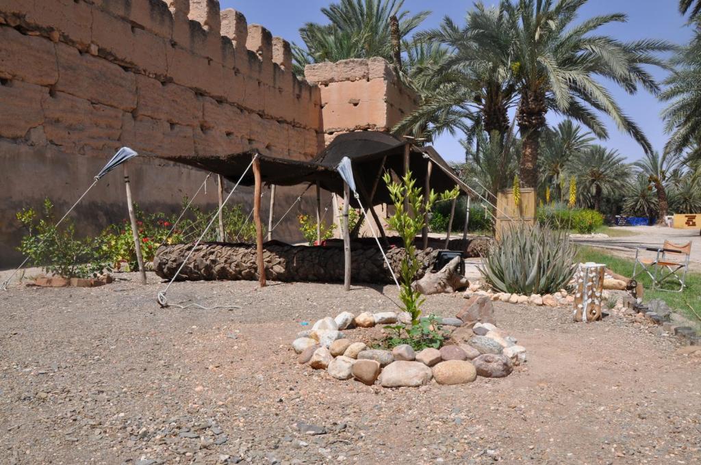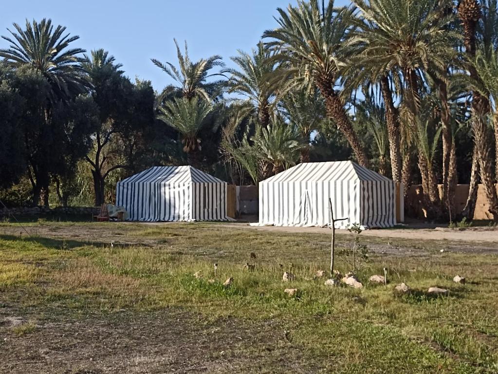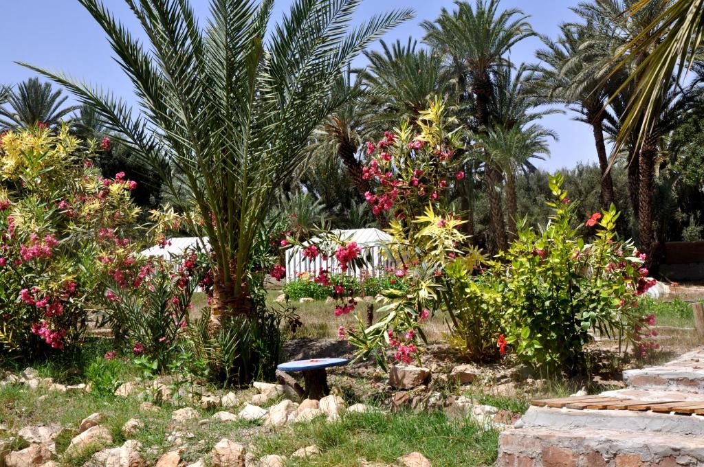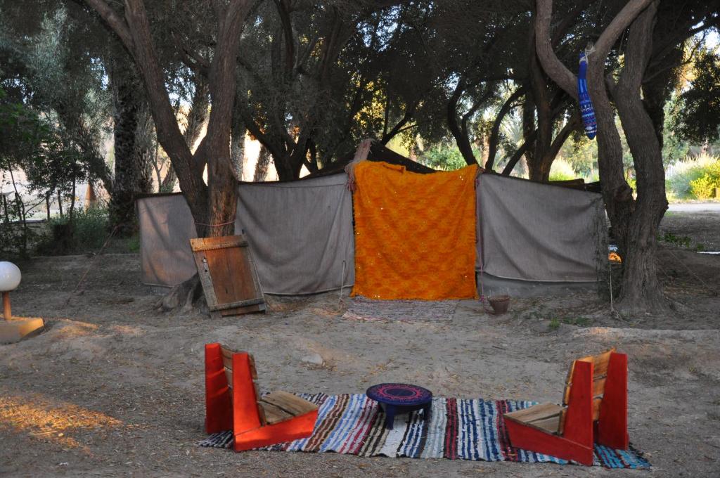 En plus des emplacements de camping disponibles pour les camping-cars et les voyageurs traditionnels, cet établissement propose diverses options d’hébergement, notamment des tentes nomades situées sous les oliviers avec des installations sanitaires partagées, ainsi que des tentes caïdales installées parmi les palmiers, offrant des sanitaires privatifs.